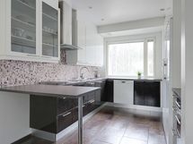 - Keraaminen liesi, Jääkaappi, Pakastin, Kaapisto, Liesituuletin, Astianpesukone, Erillisuuni