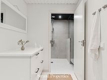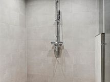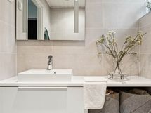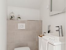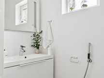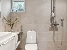Suihku, allaskaapisto, valopeili, bidee-suihku, wc-istuin.
