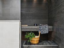 - Kuvaus: Lauteet, sähkökiuas, laattalattia, seinät kaakeli, lattialämmitys (vesikiertoinen) ja paneelikatto. .