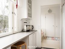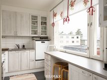 - Työtason materiaali: Laminaatti. Kaapistot, tasot, jääkaappi, pakastinkaappi, keraaminen liesi, liesituuletin, astianpesukone. Välitila: Laatta.