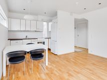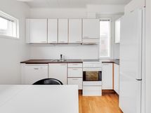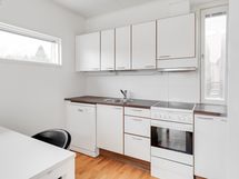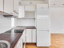 - Jääkaappi/pakastin, uuni, keraaminen liesi, astianpesukone, astianpesukoneliitäntä, kaapistot, liesituuletin hormiin. Lattia: Parketti. Seinät: maalattu