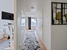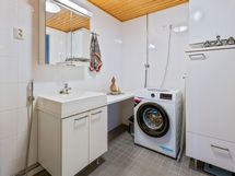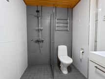 - Pesutilojen varusteet: Suihkuseinä, lattialämmitys, suihku, pesukoneliitäntä, wc-istuin, peilikaappi ja allaskaappi.