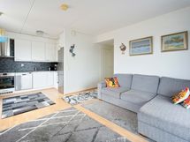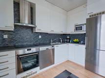 - Keittiön varusteet: Jääkaappipakastin, liesituuletin ja astianpesukone. Liesi: Keraaminen liesi. Työtason materiaali: Laminaatti.