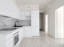 Induktioliesi, Jääkaappipakastin, Kaapisto, Liesituuletin, Astianpesukone, Erillisuuni, Pesukoneliitäntä