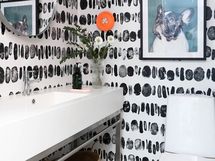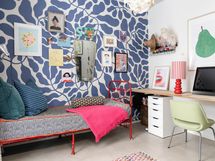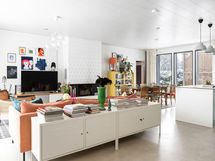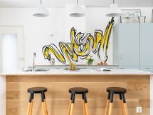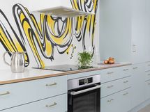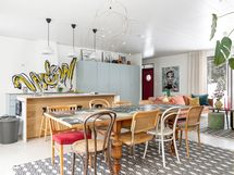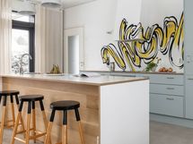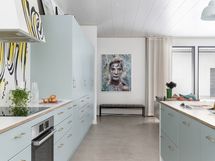 - Kitzenin vaaleanvihreä keittiö messinkisillä lankavetimillä, suurella saarekkeella (istumapaikat), aamiaiskaapilla ja integroiduilla Boschin laitteilla. Saarekkeessa tammiparketti, työtasoina laminaattipinnoitettu koivuvaneri. Seinävalaisimet Domus Classican. Pete Pihlajamaan maalaama seinämuraali. Saarakkeessa on kätevä pistorasia esim. pienkodinkoneille. Seinämaali roiskevedenkestävä Luja maali. Tikkurilan sävy Paperi. Boschin kodinkoneet (induktioliesi, jääkaappi/pakastin ja astianpesukone) 2017. Lattia: betoni.