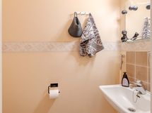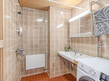 Varusteet: Suihku, pesukone, pesukoneliitäntä, pesuallas, peili ja peilikaappi. Erillisten WC:n lukumäärä: 1. Erillisen WC:n kuvaus: bideesuihkun päät ja vessan istuinkansi vaihdettu 2024.