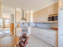 - Liesi: Keraaminen liesi. Työtason materiaali: Graniitti. Keittiö on remontoitu vuonna 2005 (Olive-Keittiöt): Kaapistot puuta (Kustavin Puu Oy), työtaso graniittia (Ylämaan Graniitti Oy), astianpesukone on integroitu vedettävä malli (Fisher&Paykel), keraaminen liesi (Smeg), erillisuuni pizzakivellä (Smeg), liesituuletin/suodatin (Smeg), välitila laatoitettu. Jääkaappi/pakastin Samsung on hankittu n. 2018. Jääkaappipakastin (Samsung), liesituuletin (Smeg), liesi (Smeg), astianpesukone (Fisher&Paykel) ja uuni (Smeg)