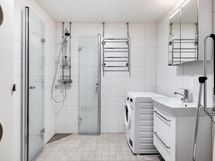 - Suihku, Pesukoneliitäntä, Tilaa pesukoneelle, Käsisuihku, Kaapisto, Allas, Suihkuseinä, WC-istuin, Peilikaappi