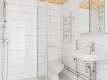 - Saunassa on sähkökiuas. Kylpyhuoneessa on suihku, suihkuseinä, peilikaappi, pesukoneliitäntä, sähköinen lattialämmitys ja pyyhekuivain ja kiinteät valaisimet. Kylpyhuone on uusittu 2021 yhtiön toimesta.