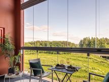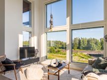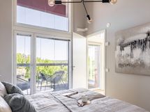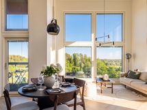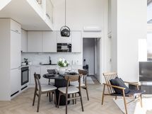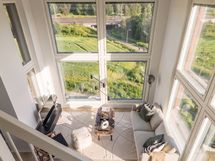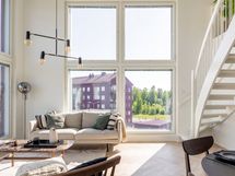 Ylimmän kerroksen loft-kulmahuoneisto näyttävillä maisemaikkunoilla.
