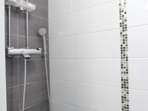 - Pesutilojen kuvaus: Kaakeloidut seinät, laattalattia. Wc-toiminnot samassa tilassa. Varustus; suihku, peili- ja allaskaappi, kaapistot, pesukoneliitäntä, pyyhekuivain (ei toiminnassa).