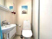 - Pesutilojen kuvaus: Laatoitettu kylpyhuone, jossa suihkukaappi. Varusteena kaapistoa, peilikaappi, allas, pyykinpesukoneliitäntä, lattialämmitys (sähkö). . Erillisen WC:n kuvaus: Erillinen wc, jossa lattiat ja seinät muovimattoa. Tilassa hyvin kaapistoa.
