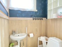 Varusteena lavuaari, bidet-suihku, peili, wc-istuin sekä vesikiertoinen patteri.