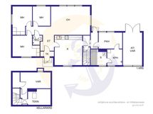 - Muut tilat autotalli ja varasto. Lisäksi kellaritilat 38 m². Pinta-aloja ei ole tarkistemitattu.