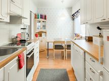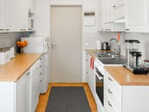 - Jääviileäkaappi, pakastekaappi, jenkkikaappi keittiössä, keraaminen liesi, liesituuletin, astianpesukone, kaapistot, kiinteät valaisimet. Keittiö remontoitu v. 1999-2000
