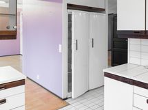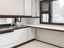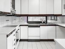 Jääkaappi, pakastekaappi, lattialiesi, liesituuletin, leivinuuni, astianpesukone, kaapistot, kiinteät valaisimet.