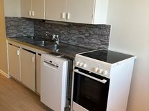 Paljon kaappitilaa, Laminaattitasot, Sähköliesi, Jääkaappi, Pakastin, Astianpesukone