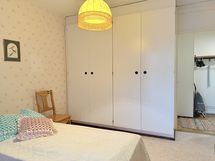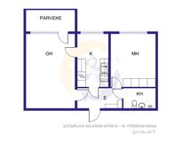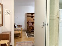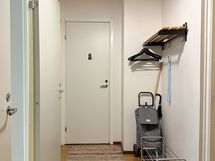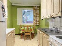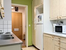 - Keittiössä maalatut seinäpinnat ja muovimattolattia. Vaaleat, pinnoitetut kaapistojen ovet ja laatikostojen etusarjat. Varusteina: jenkkikaappi ja sähköliesi.