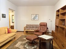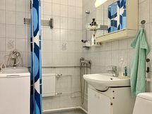 - Pesutilojen kuvaus: Tilava kylpyhuone, jossa kaakeloidut seinät ja laatoitettu lattia (laatoitus tehty v.1988, entinen muovimatto/-tapetti jätetty alle). Remontin yhteydessä tilasta poistettiin amme. Allas- ja peilikaappi. Pk-liitin. WC-toiminnot samassa tilassa.
