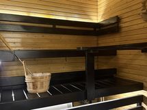 - Kuvaus: Paneloidut seinät ja laatoitettu lattia. Tummiksi sävytetyt lauteet. Vuolukivinen, sähkölämmitteinen kiuas.