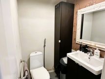 - Kylpyhuone, suihku, erillinen wc, puusauna, peilit, pesukoneliitäntä, lattialämmitys, kiinteät valaisimet, kylpyhuonekaapisto. Lattia: Laatta. Seinät: Laatta