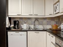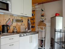 - Liesi: puuliesi, erillisuuni, liesitaso. Työtasot: puu. Kylmäsäilytys: jääkaappi, pakastin. Varustus: astianpesukone, kiinteät valaisimet, liesituuletin / hormi.
