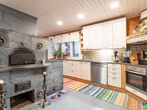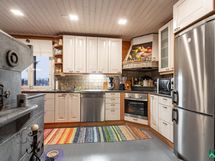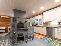 Jääkaappi/pakastin, astianpesukone, liesikupu/-tuuletin, keraaminen liesi, puuhella, leivinuuni, kaapistot