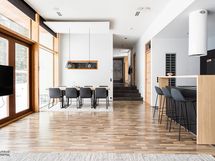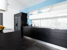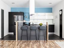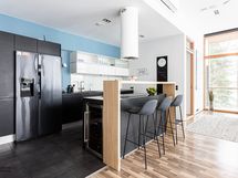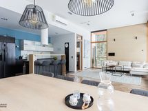 - Keittiön varusteet: Jääkaappipakastin, erillisuuni, liesituuletin, astianpesukone, keittiösaareke ja mikroaaltouuni. Liesi: Induktioliesi. Työtason materiaali: Laminaatti.