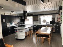 - Tilaa isolle ruokapöydälle, Paljon kaappitilaa, Paljon työskentelytilaa, Puutasot, Integroidut koneet, Astianpesukone, Keraaminen liesi, Jääkaappi, Suuri tiskipöytä, Lasikaapit, Pesukoneliitos, Liesisaareke, Pakastin