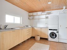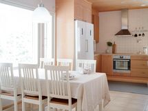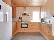 - Jääkaappi, pakastekaappi, erillisuuni, liesitaso, induktioliesi, liesituuletin, mikroaaltouuni, astianpesukone, kaapistot, kiinteät valaisimet, pöytätasojen materiaali Laminaattitaso.