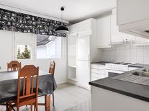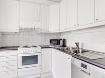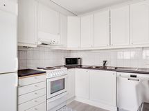 - Jääkaappi, pakastekaappi, lattialiesi, liesituuletin, astianpesukone, kaapistot, irralliset kaapistot, kiinteät valaisimet. Irrallinen kaappi keittiössä. Sen tilalle mahtuisi myös isompi jääkaappi pakastin jos haluaa.