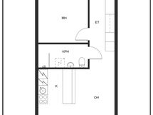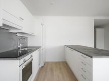 - Työtaso: Laminaattitaso. Jääkaappipakastin, liesi, liesituuletin hormiin, astianpesukonevaraus, kiinteät valaisimet, kaapistot, saareke