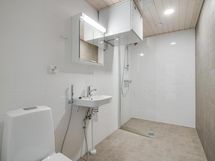 - Kylpyhuone, suihku, suihkuseinä, pesukoneliitäntä, peili, lattialämmitys. WC: Kylpyhuoneen yhteydessä . Varusteet: Lattialämmitys