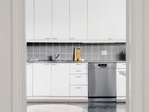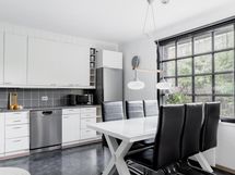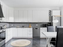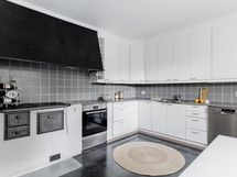 - Jääkaappi, pakastekaappi, sähköliesi, liesikupu, astianpesukone, kaapistot, kiinteät valaisimet, pöytätasojen materiaali laminaatti.