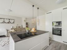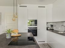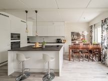 - Keittiön varusteet: Jääkaappi, erillinen pakastin, erillisuuni, liesi (tasoliesituuletin) ja mikroaaltouuni. Liesi: Induktioliesi. Työtason materiaali: Laminaatti. Keittiöremontti tehty 2021: Keittiömaailman kaapistot, uudet integroidut kodinkoneet, keittiön ja olohuoneen väliltä poistettu seinä, lattia uusittu. Keittiössä runsaasti säilytystilaa, saarekkeen molemmin puolin kaapistoja.