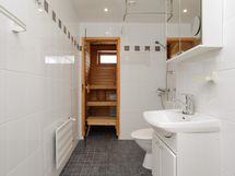 - Sauna, sähkökiuas, kylpyhuone, suihku, peilit, peilikaappi, kaapit, allaskaappi, pesukoneliitäntä, kiinteät valaisimet.
