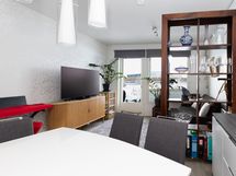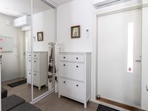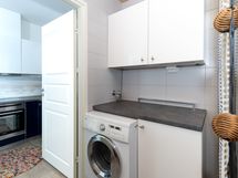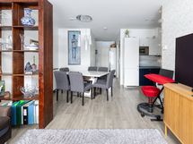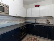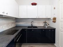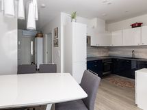 - Keittiön varusteet: Jääkaappipakastin, liesi, liesituuletin, astianpesukone, erillisuuni ja kiertoilmauuni. Liesi: Induktioliesi. Työtason materiaali: Laminaatti.
