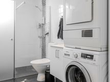 - Pesutilojen kuvaus: Tyylikäs kylpyhuone tehty 2018, vesieristetty, laatoitettu, suihkuseinät, ikkuna, peili-ja allaskaappi, pesukoneliitäntä (myös pesukone ja kuivausrumpu voivat jäädä), kaapistot.