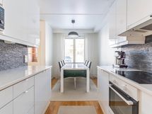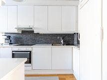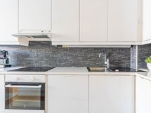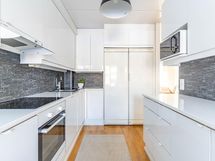 - Jääkaappi, pakastin, induktioliesi, liesituuletin hormiin, astianpesukone. 2019 uusittu lavuaari, tasot, keittotaso, uuni, kaappien ovet.