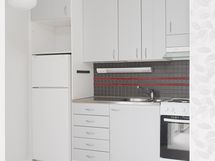 - Liesi: sähköliesi. Kylmäsäilytys: jääkaappi. Varustus: liesituuletin, kiinteät valaisimet. Toimiva keittokomero, jossa kaapistojen alla laatta.