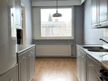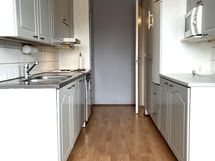 - Jääkaappi, sähköliesi (alkuperäinen), liesituuletin (alkuperäinen), kaapistot (ovet vaihdettu noin vuonna 2002), kiinteät valaisimet.