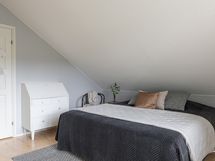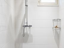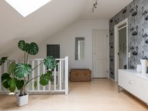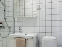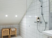 Varustus yläkerran wc: suihku, suihkuseinä, lasitiiltä tuomassa valoa, peilikaappi, allaskaappi, bidee, lattialämmitys sähköllä. .