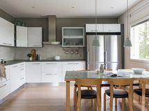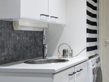 - Työtasot: laminaatti. Kaapistot: valkoinen sileä korkeakiilto.