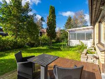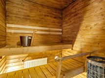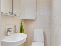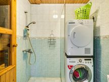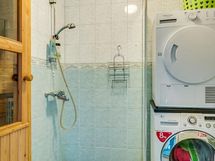 - Kylpyhuoneessa : suihku, lasinen suihkuseinä, pyykinpesukoneliitäntä, sauna, kiinteä valaisin. Erillisessä WC:ssä : WC-istuin, käsienpesuallas, bide-suihku, peilikaappi, kiinteä valaisin