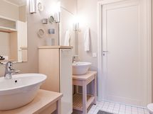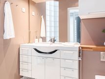 - Pesutilojen varusteet: Allaskaappi, wc-istuin, lattialämmitys, peili, suihku, poreamme ja kiinteät valaisimet. Pesutilojen kuvaus: Pukuhuonetila, naulakot, bideesuihku, kaksi allasta. Erillisten WC:n lukumäärä: 1. Erillisen WC:n varusteet: Bidee-suihku. Erillisen WC:n kuvaus: Seinä wc, peili, laatikosto, kaappeja.