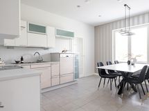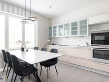 - Keittiön varusteet: Erillinen pakastin, astianpesukone, mikroaaltouuni, jääkaappi, erillisuuni, liesi ja kiinteät valaisimet, liesituuletin / hormi. Liesi: Induktioliesi ja erillisuuni. Työtason materiaali: Laminaatti. Puustellin keittiö. Keittiössä kaksi allasta/vesihanaa.