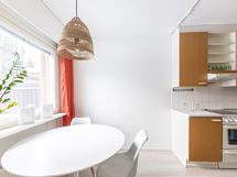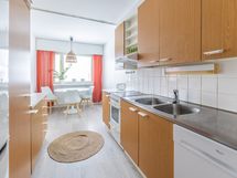- Keittiön varusteet: Jääkaappipakastin, liesituuletin ja astianpesukone. Liesi: Keraaminen liesi. Työtason materiaali: Puu.