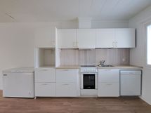 Laminaattitasot, Teräskalusteet, Astianpesukone, Pesukoneliitos, Liesituuletin, Sähköliesi, Jääkaappi
