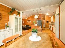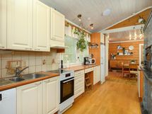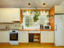 - Jääkaappi, lattialiesi, liesitaso, sähköliesi, keraaminen liesi, liesituuletin, leivinuuni, astianpesukone, kaapistot, kiinteät valaisimet, pöytätasojen materiaali laminaatti.
