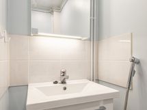 Varusteet: suihku, wc-istuin, peilikaappi, allaskaappi, allas, bidee-suihku.